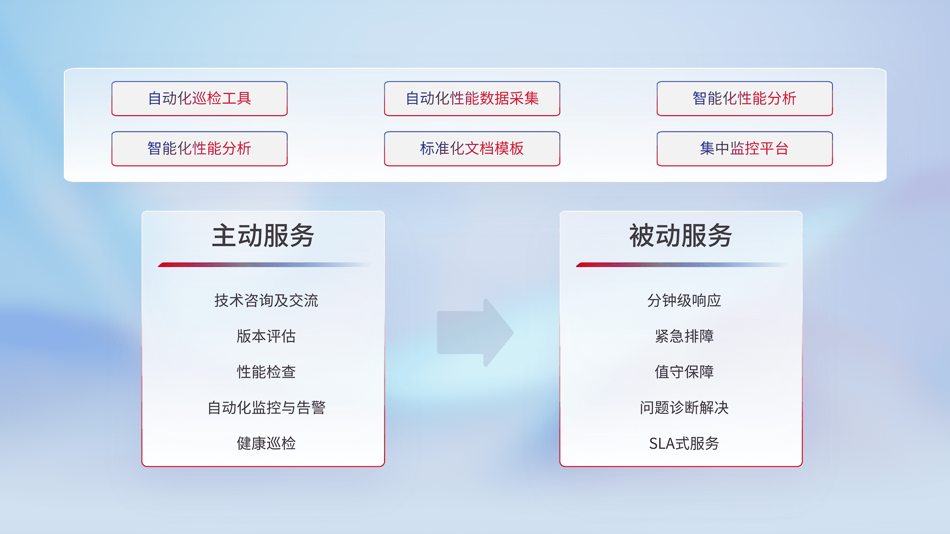 智能化工具和标准化文档,,,保障服务质量,,,,提供主动服务(包含技术咨询、、、、版本评估、、、、性能检查、、、自动化监控与告警、、、健康巡检)和被动服务包含(分钟级响应、、紧急排障、、值守保障、、问题诊断解决、、、、SLA服务)。。。